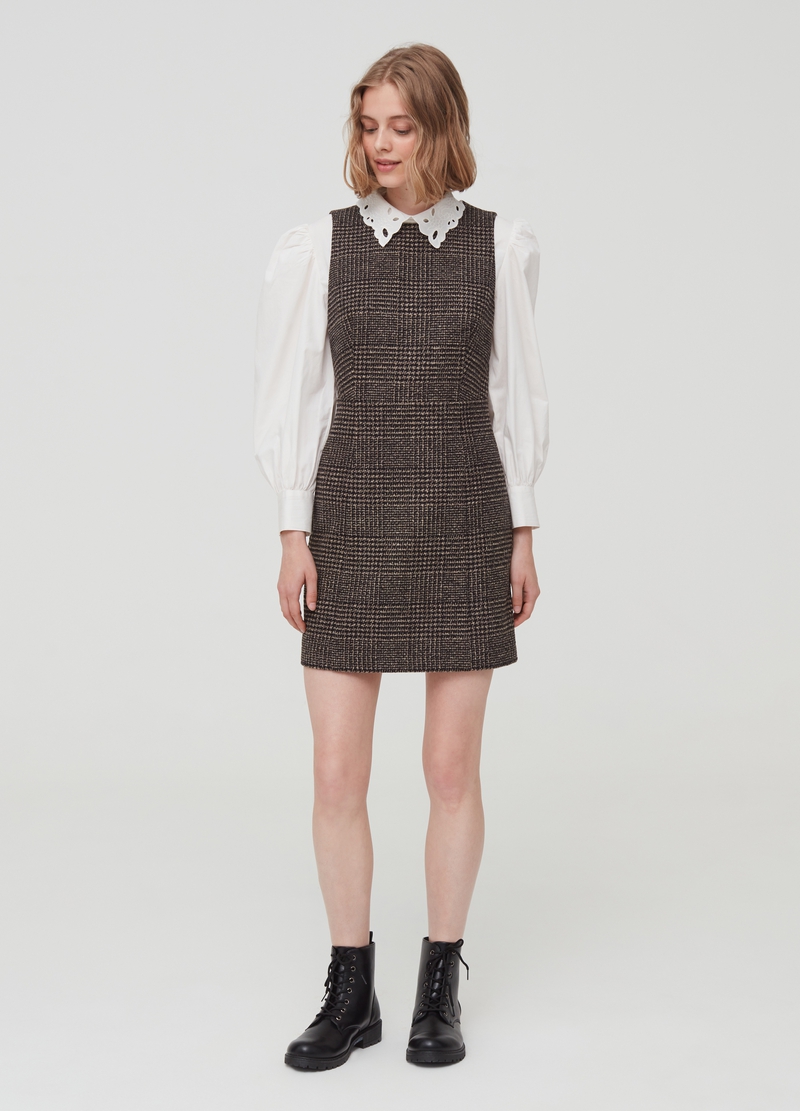 Short sleeveless dress in wool, cotton and viscose blend. Round neck. Zip fastening on the back. Prince of Wales pattern.